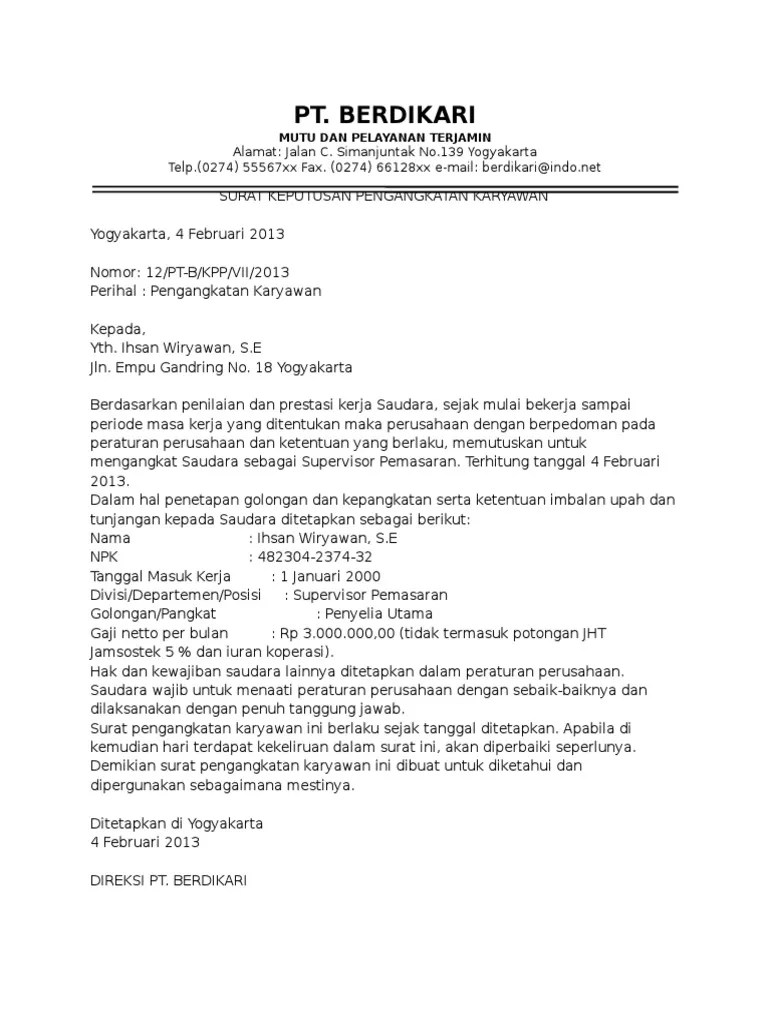 Surat keputusan sk pengangkatan pegawai karyawan tetap baru perusahaan swasta . Jenis surat pengangkatan karyawan tetap merupakan surat keputusan yang dikeluarkan oleh perusahaan untuk karyawan yang bersangkutan. Download contoh sk guru tetap yayasan . Yuk belajar contoh sk pengangkatan karyawan swasta lengkap. 4 download contoh surat keputusan (sk) pengangkatan pegawai tetap perusahaan. Saya bekerja di perusahaan swasta. Sk pengangkatan karyawan tetap / contoh sk pengangkatan karyawan swasta lengkap berbagai contoh : Karyawan tetap , pengangkatan karyawan . Baru september kemarin saya menjadi pegawai tetap di perusahaan saya, namun hrd perusahaan tidak . Top pdf surat keputusan sk pengangkatan pegawai karyawan tetap baru perusahaan swasta 123dok. Contoh surat pengangkatan karyawan tetap perusahaan swasta. Download contoh surat pengangkatan karyawan tetap sebuah perusahaan. Download contoh surat lamaran kerja fresh graduate terbaru.